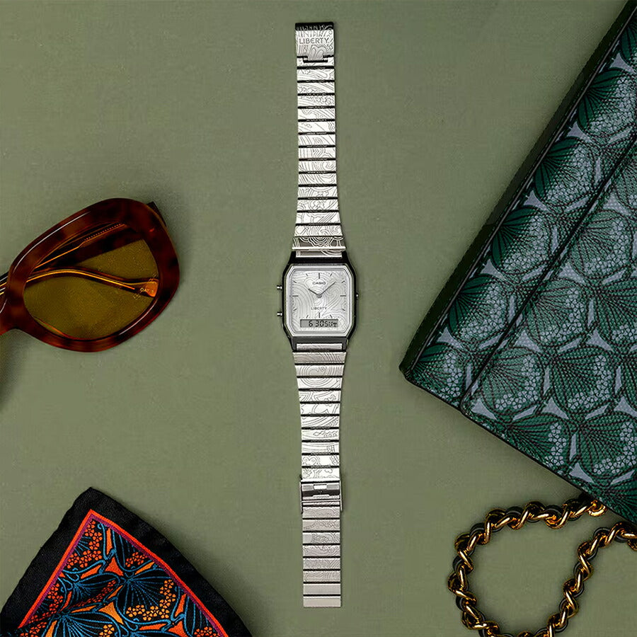 クラシカルな角型ケースのAQ-230と英国老舗デザインハウスのリバティとのコラボレーションモデルです。
