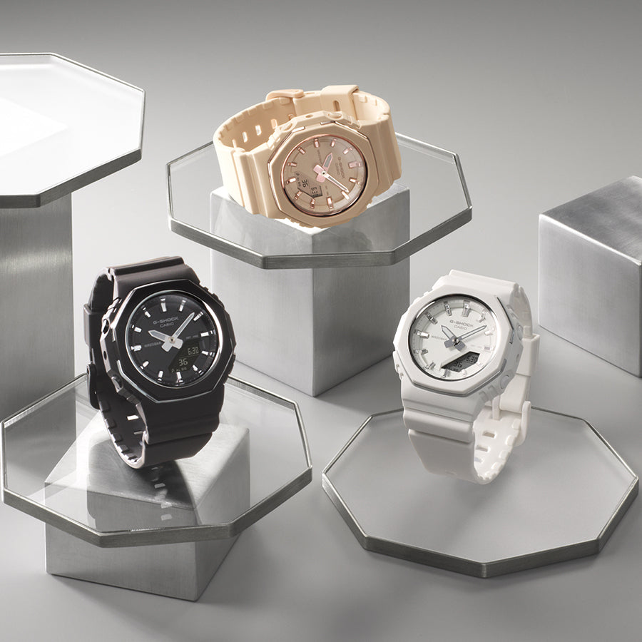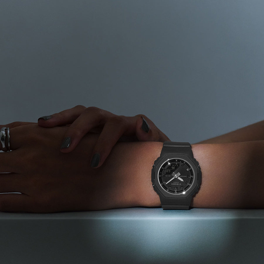 人気のアナログ・デジタルコンビネーションシリーズからベゼルの内側と外側からのぞくメタリックリングが印象的なモデルが仲間入り。GMA-P2100シリーズと同等のサイズ・装着感でありながら、メタリックパーツのさりげない輝きが高級感や洗練さを演出しています。