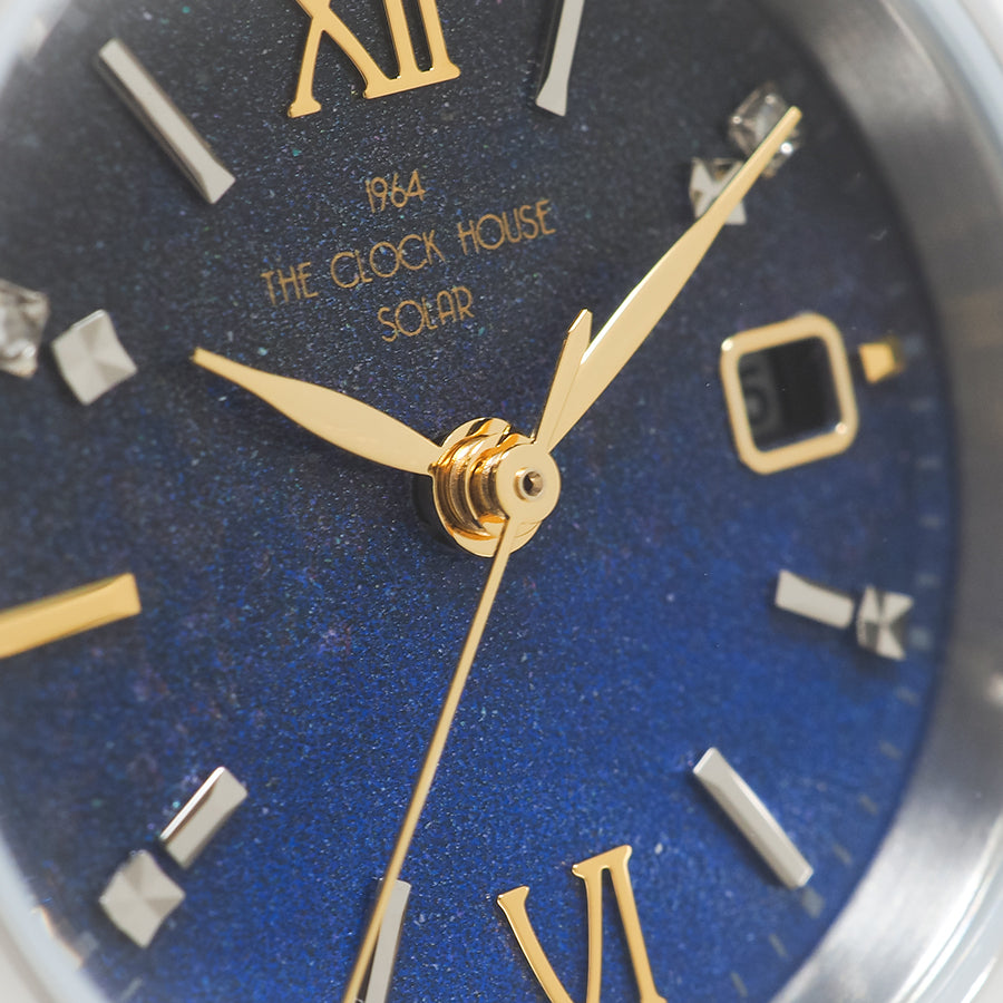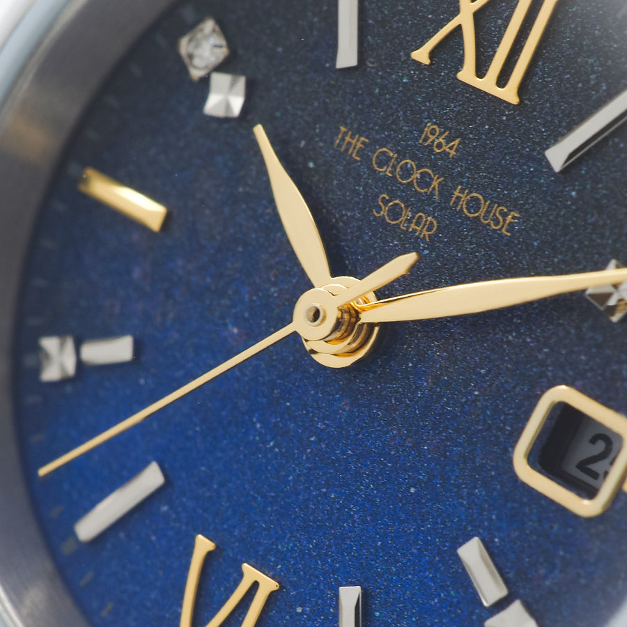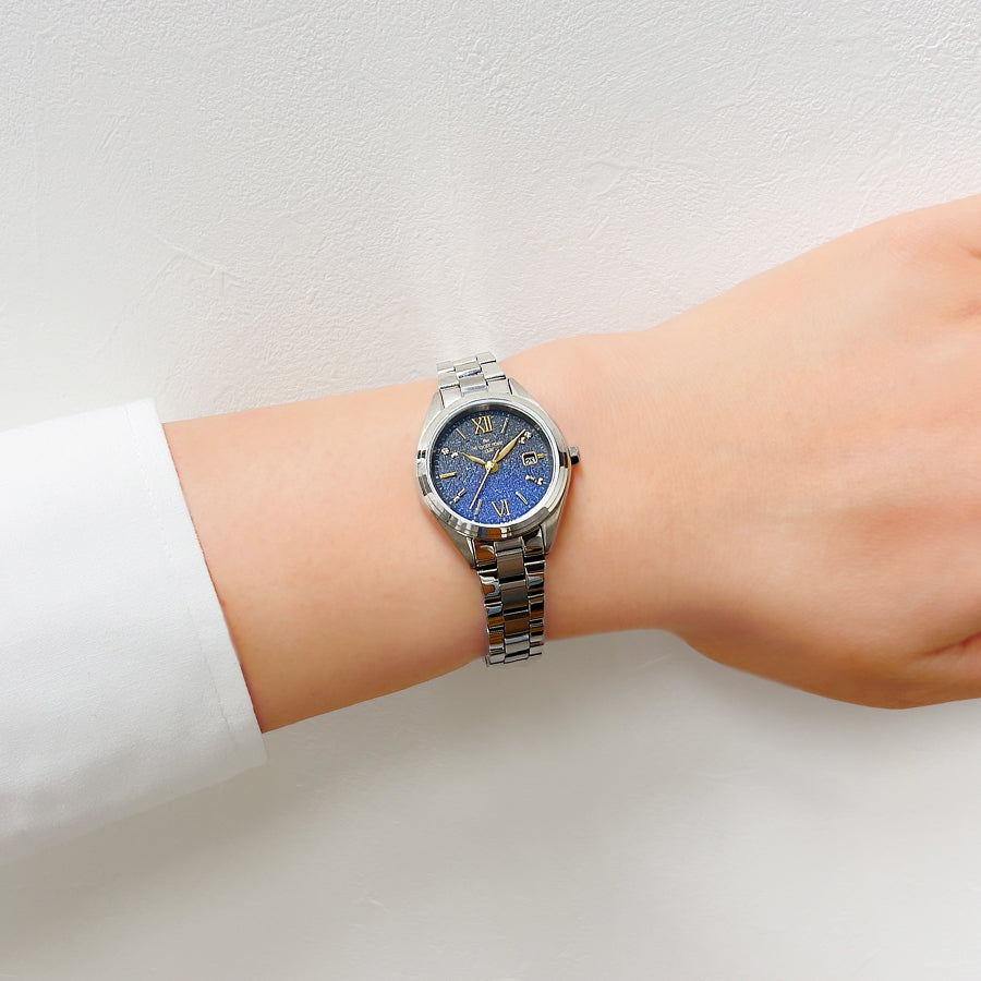 ダイヤルには、夜空を思わせるネイビーグラデーションを採用。繊細なラメ加工を施し、無数の星屑が瞬くような表情をプラス。見る角度によって光の粒が揺らめき、冬の夜空を思わせる奥行きある輝きを放ちます。さらに、イエローゴールドカラーの針とインデックスが、月光のような優しい光を添えています。