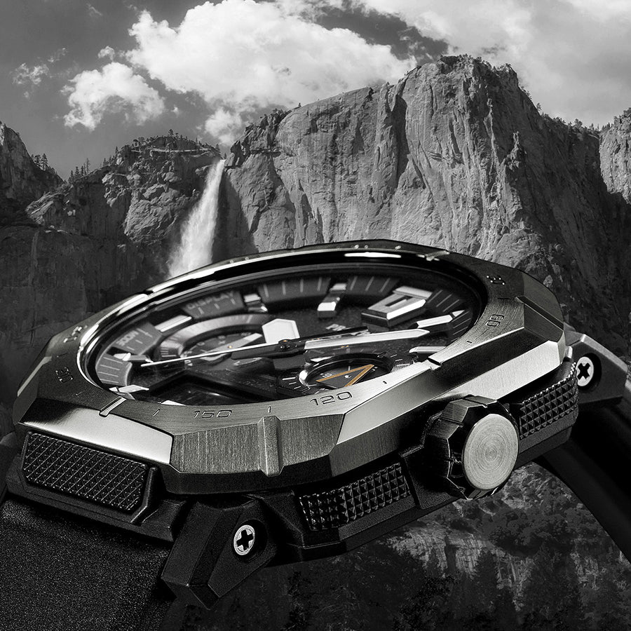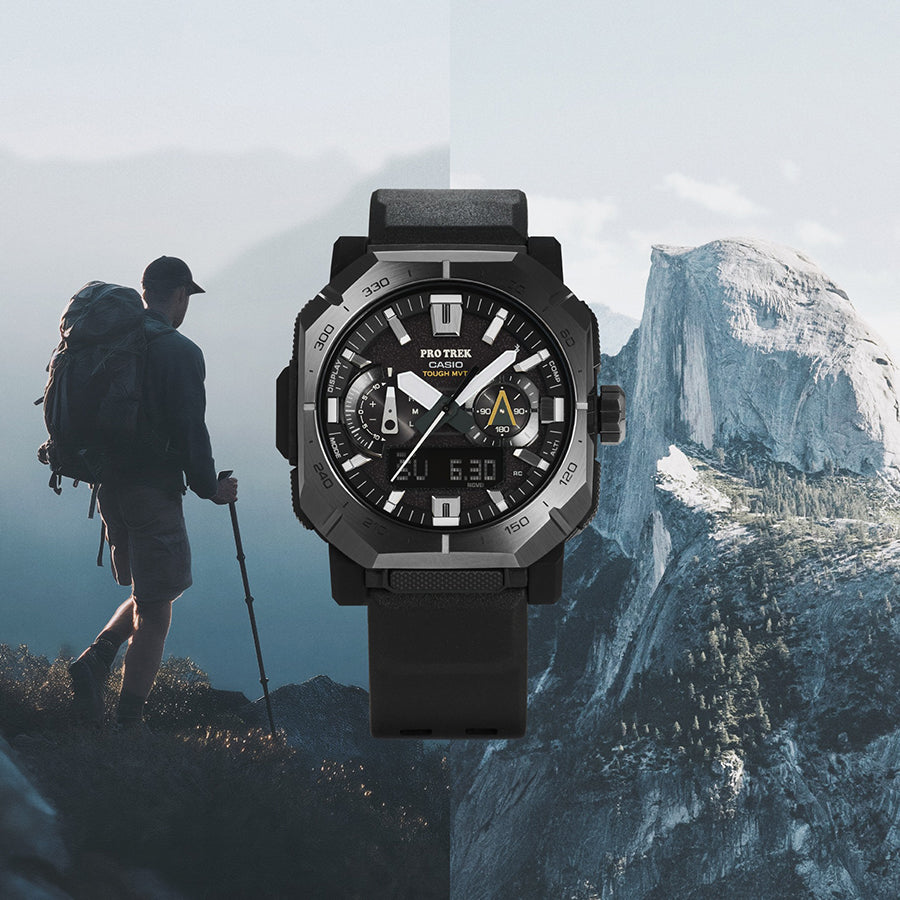 大自然を舞台に活躍する本格アウトドアウオッチ、PRO TREK PRW-B1000。アウトドアの聖地「ヨセミテ 」のエル・キャピタンをイメージした角型ステンレススチールベゼルと、かつてのロッククライマーが使用したピトンをモチーフにした9時位置の小針が、自然への敬意と冒険心を表現しています。