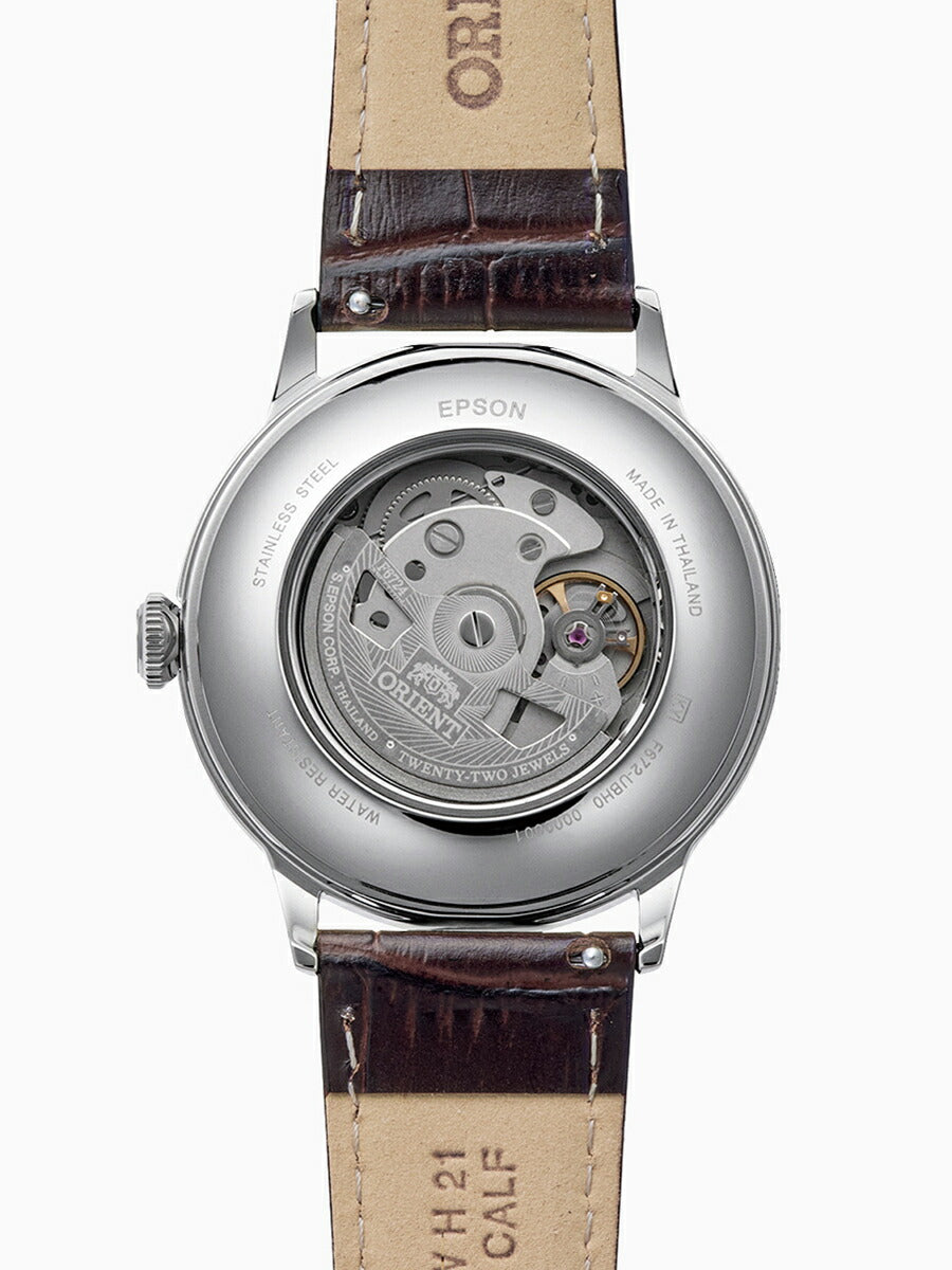 ムーブメントには、自社製自動巻き(手巻き付き)キャリバーF6724を搭載。日差+25秒から-15秒の安定した精度と、約40時間のパワーリザーブを備え、機械式時計を初めて手にする方にも安心の仕様です。
