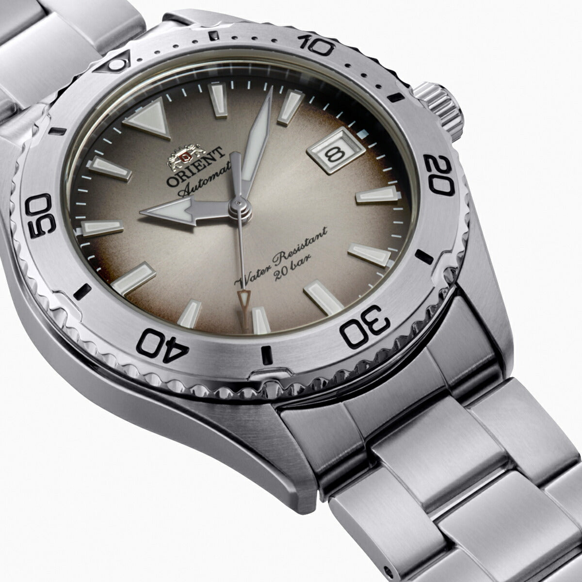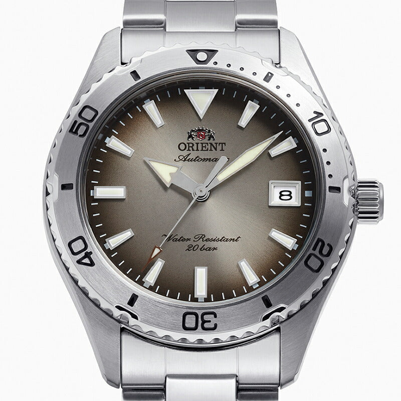 落ち着きのあるグレーを基調に、外周へ向かって深みを増すグラデーション文字板には、金属の質感を際立たせる放射目仕上げを採用。光の角度によって表情が変化し、シンプルながらも奥行きのあるデザインを楽しめます。ダイバーデザインの力強さと、都会的で洗練された印象を併せ持つ一本です。