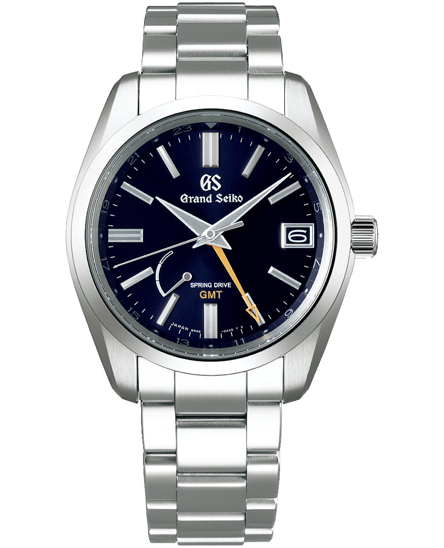 ダイヤルカラーは黒に近いミッドナイトブルーを採用し、グランドセイコーの王道デザインのケースと組み合わせたスプリングドライブGMTモデルです。