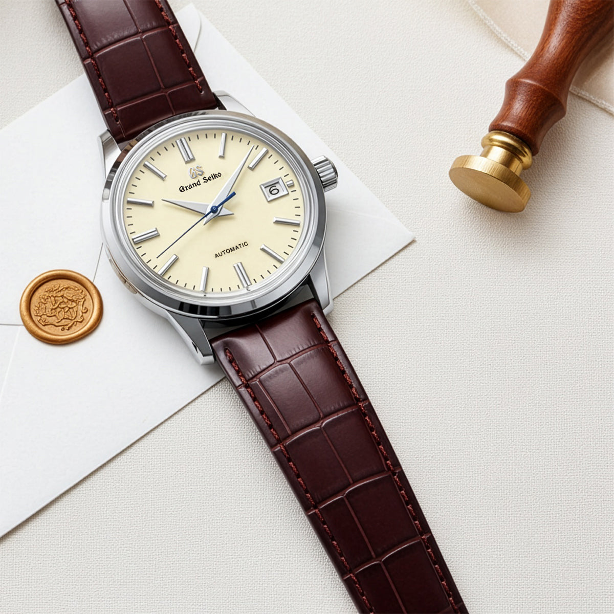 昔ながらのクラシカルなフォルムを蘇らせたボックス型サファイアガラス、繊細なザラツ研磨を施した緩やかに流れるかん足部、味わい深いアイボリー調のダイヤルにブルースチールの秒針など、上品なクラシックスタイルで纏めています。