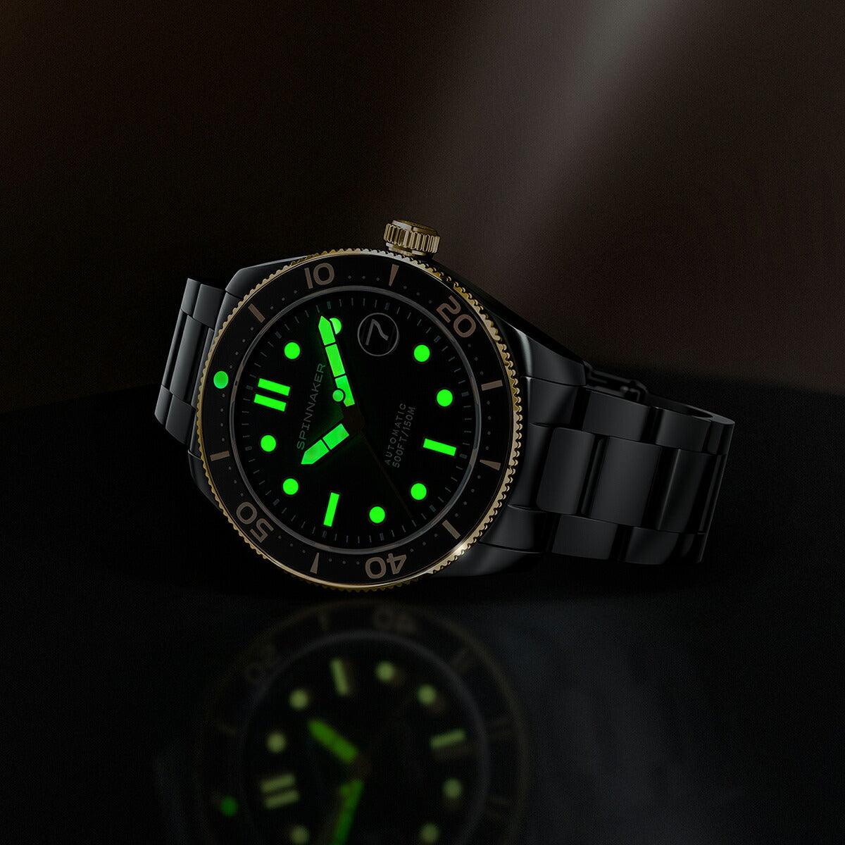 ムーブメントは信頼の日本製自動巻き(SEIKO NH35)を搭載。ガラスは反射防止コーティング付きサファイアクリスタルで視認性も耐久性も抜群。インデックス・針・ベゼルにはスイス製の蓄光「ニューライト」を採用し、夜間や暗所でもしっかりと時刻を確認できます。