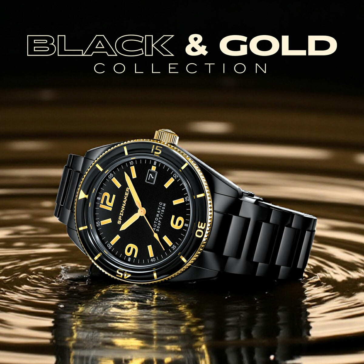 ブラックのブレスレットが手元を引き締め、ゴールドの差し色が高級感をプラスした“ブラック&ゴールド“コレクションは、オン・オフを問わず存在感を放つ、男らしいダイバーズウォッチです。