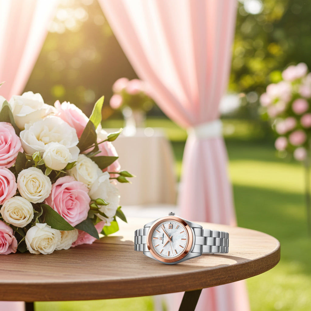18Kピンクゴールドと白蝶貝のダイヤルが華やかさを演出するレディス・クオーツモデル