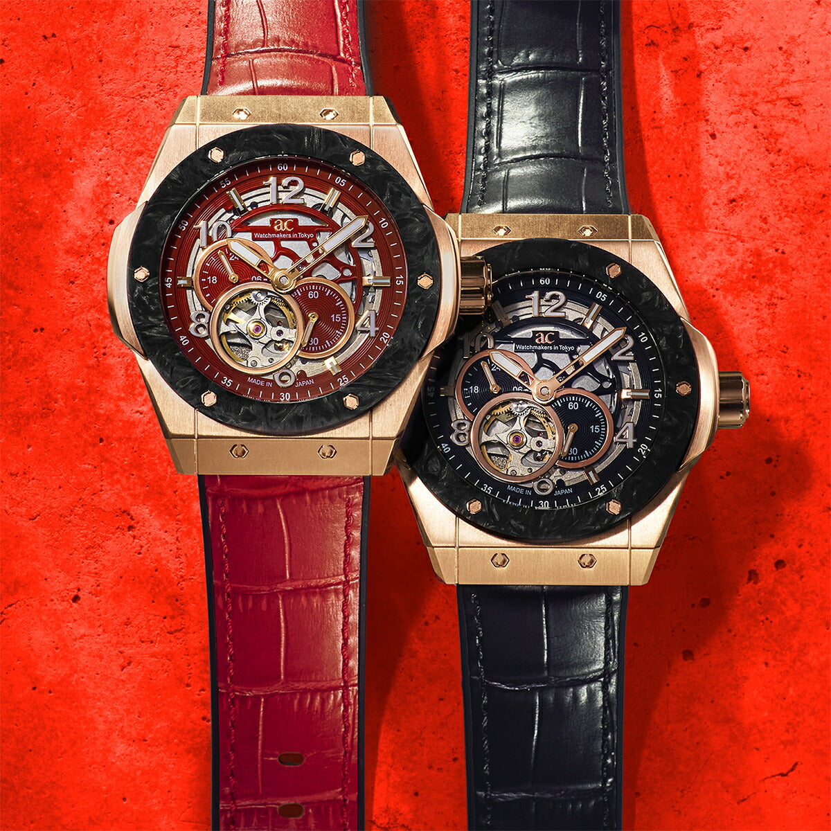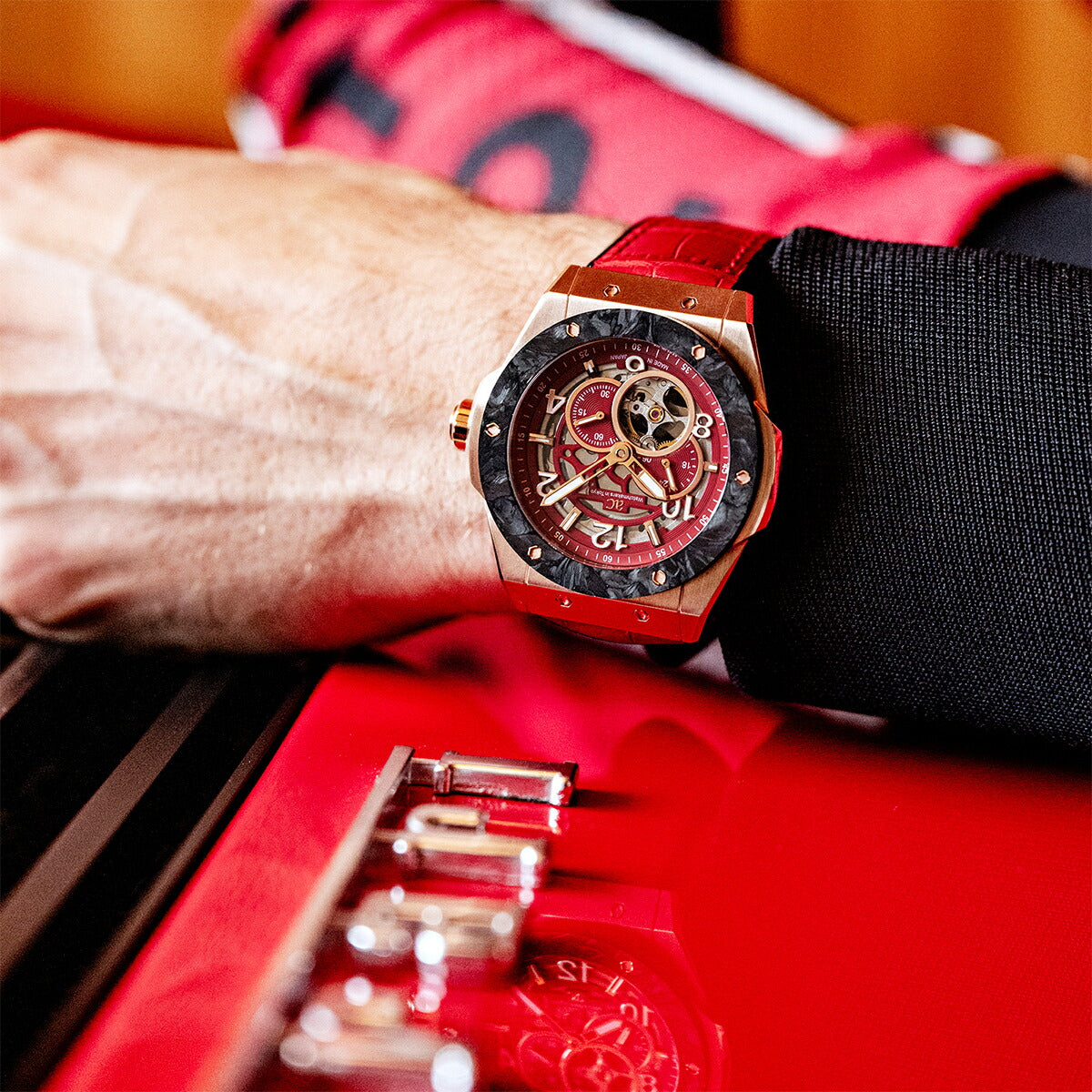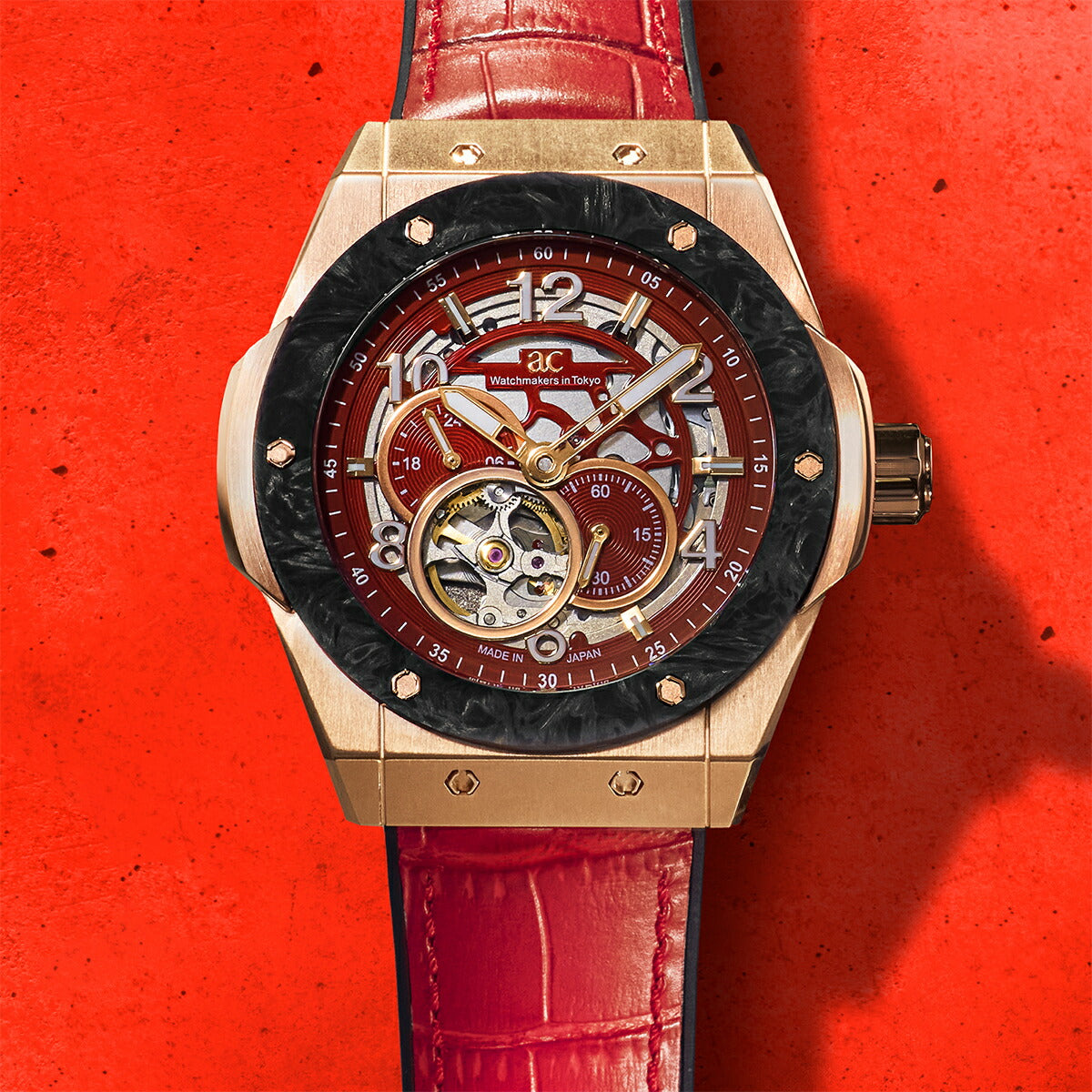 情熱的なレッドダイヤルとレザーストラップを組み合わせは、スポーティでありながらも上品さを感じるデザインに仕上がっています。