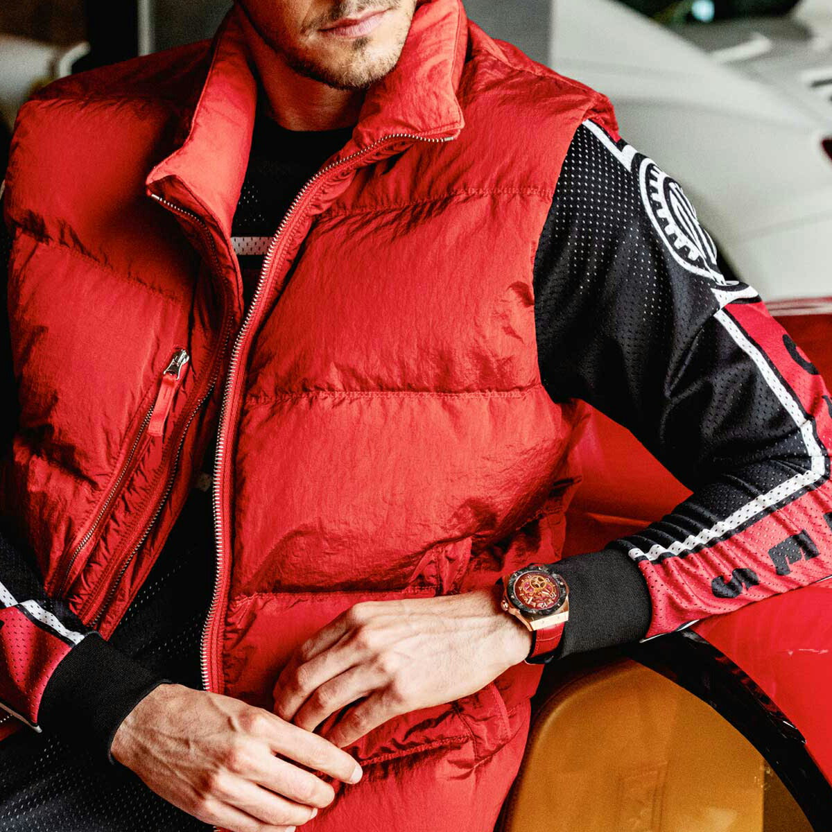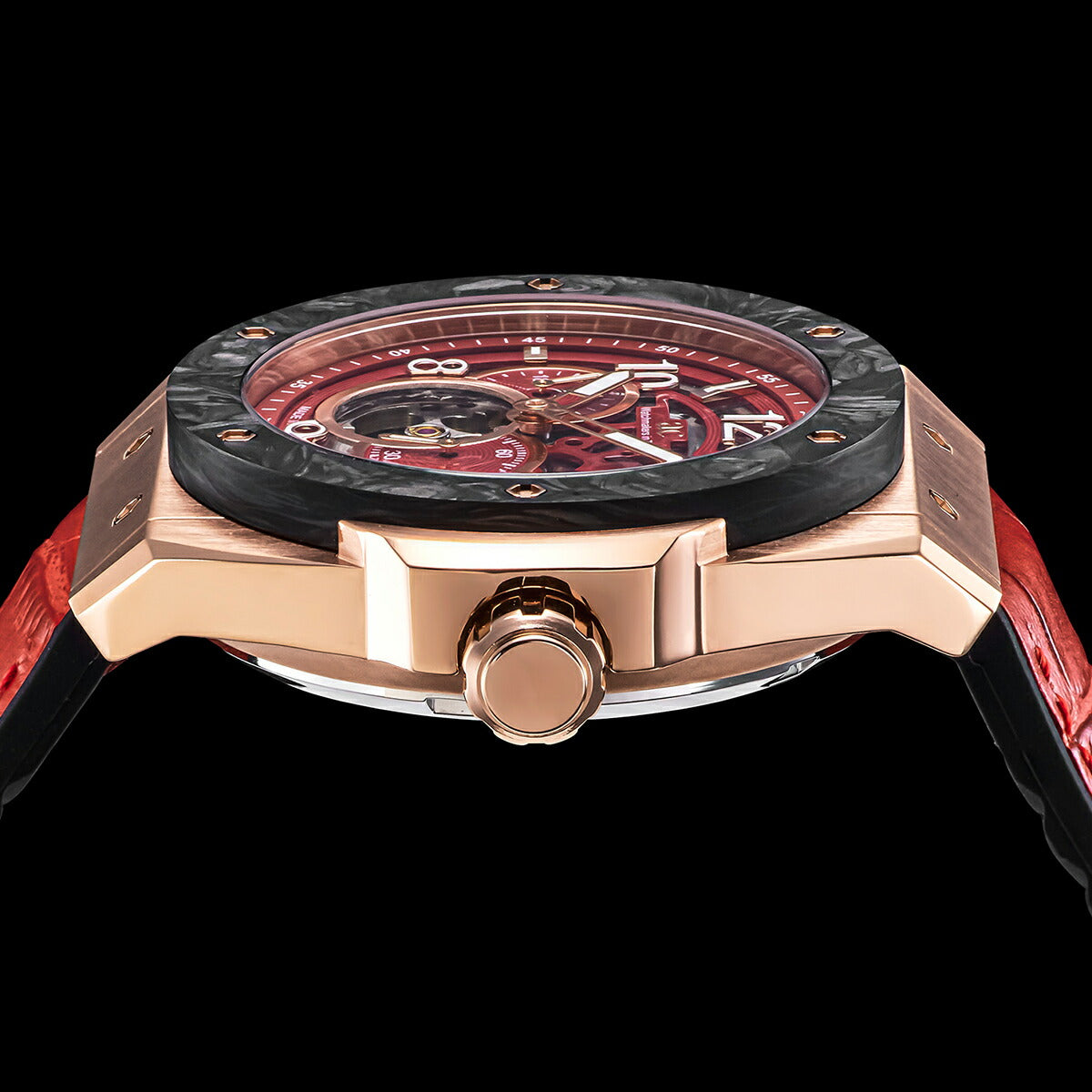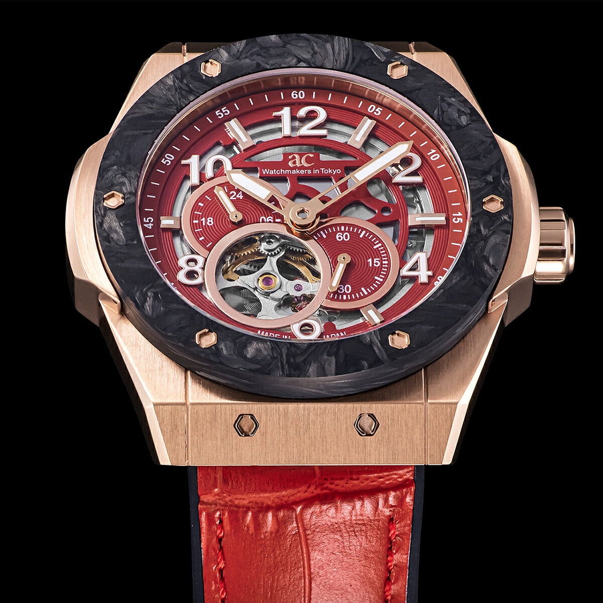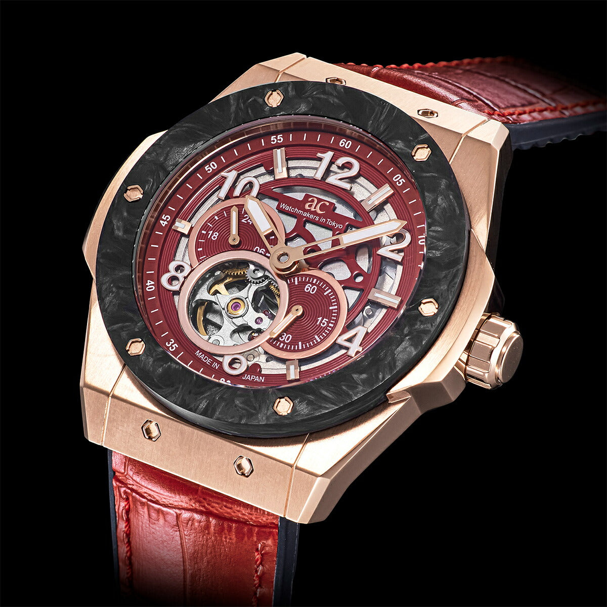 情熱的なレッドダイヤルとレザーストラップを組み合わせは、スポーティでありながらも上品さを感じるデザインに仕上がっています。