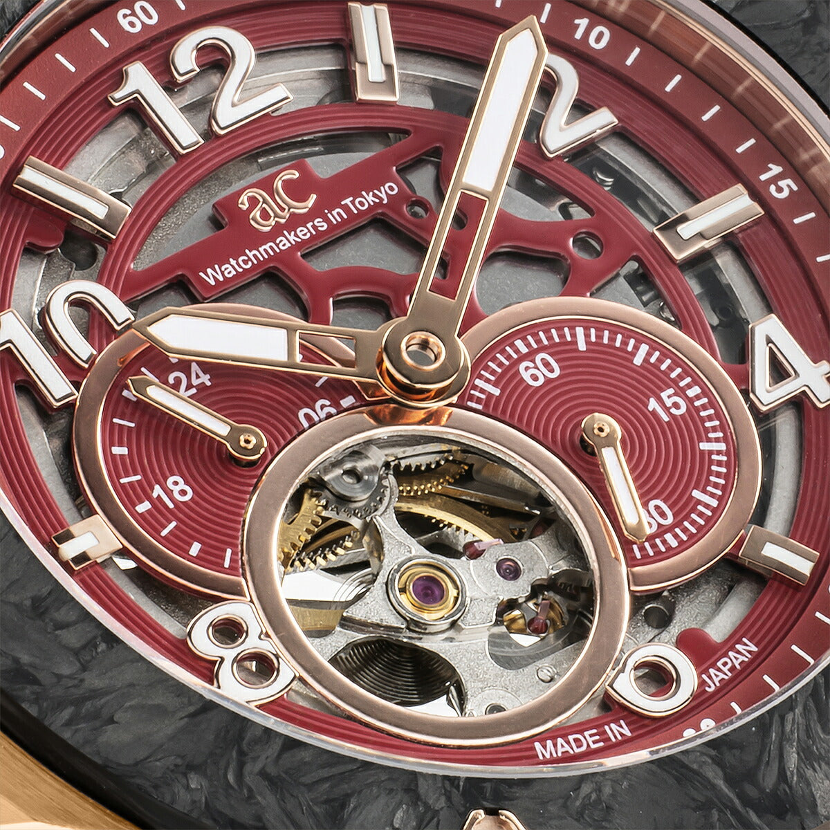 重厚感と立体感を兼ね備えたケースデザインに、高級スポーツカーを思わせるカーボンベゼルを組み合わせ、大人の腕元にふさわしい精悍でモダンな印象を与えます。