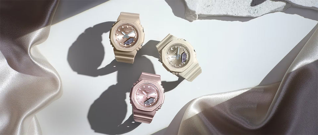 小さなサイズとシンプルなルックスが特徴のGMA-P2100シリーズに、シルクのような質感のモデルが仲間入り。ベゼルとバンドにマット仕上げの偏光パール塗装を施し、文字板には美しい輝きを放つ艶消しのメタリックカラーをあしらいました。
