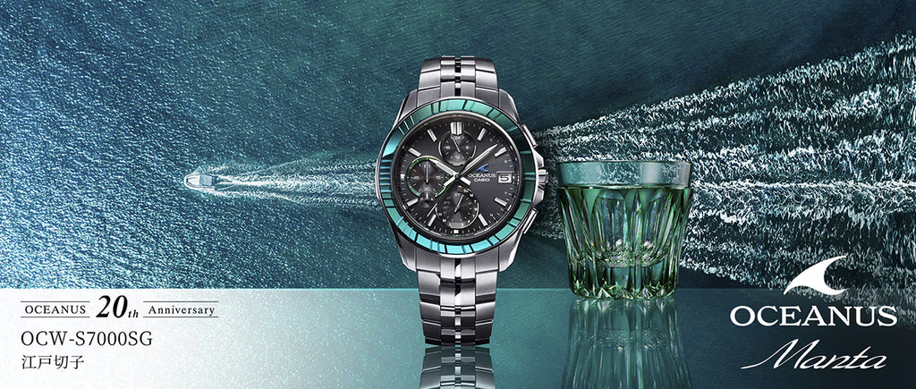 上質な仕上げと薄く美しいフォルムを追求している「OCEANUS Manta(オシアナス マンタ)」ラインから、江戸切子の職人が一つひとつ手作業で、ベゼル上のサファイアガラスに船の航跡をイメージしてカットを施しました。江戸切子にしか表現できない煌めきとシャープな美しさが魅力的な仕上がりとなっております。