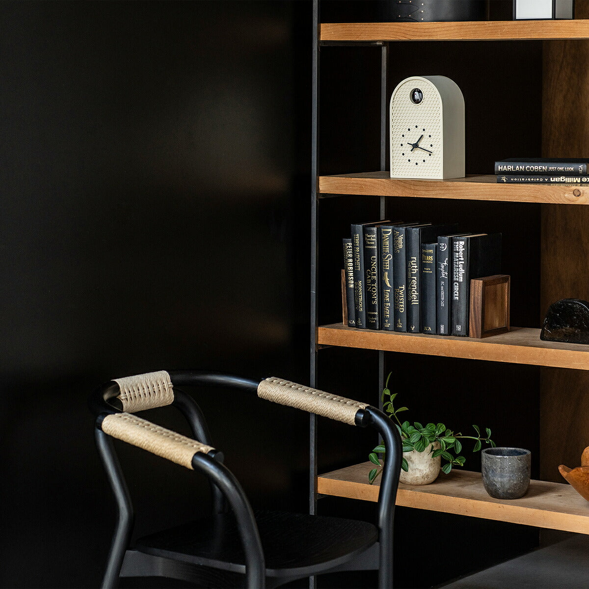 COO(クー)はパンチングメタルを用いた金属製のカッコー時計です。 西洋で古くから見られるアーチ型窓の外形をモチーフにした、金属板を半円状に曲げた外形を持ち、工業的な素材にアンティーク調の要素をミックスすることで、金属製でありながら温かみを感じます。正面にはパンチングメタルを用いる事で、多数の孔がカッコーの大きな丸穴と合わせてグラフィカルかつ軽快な印象を与えます。