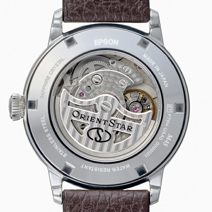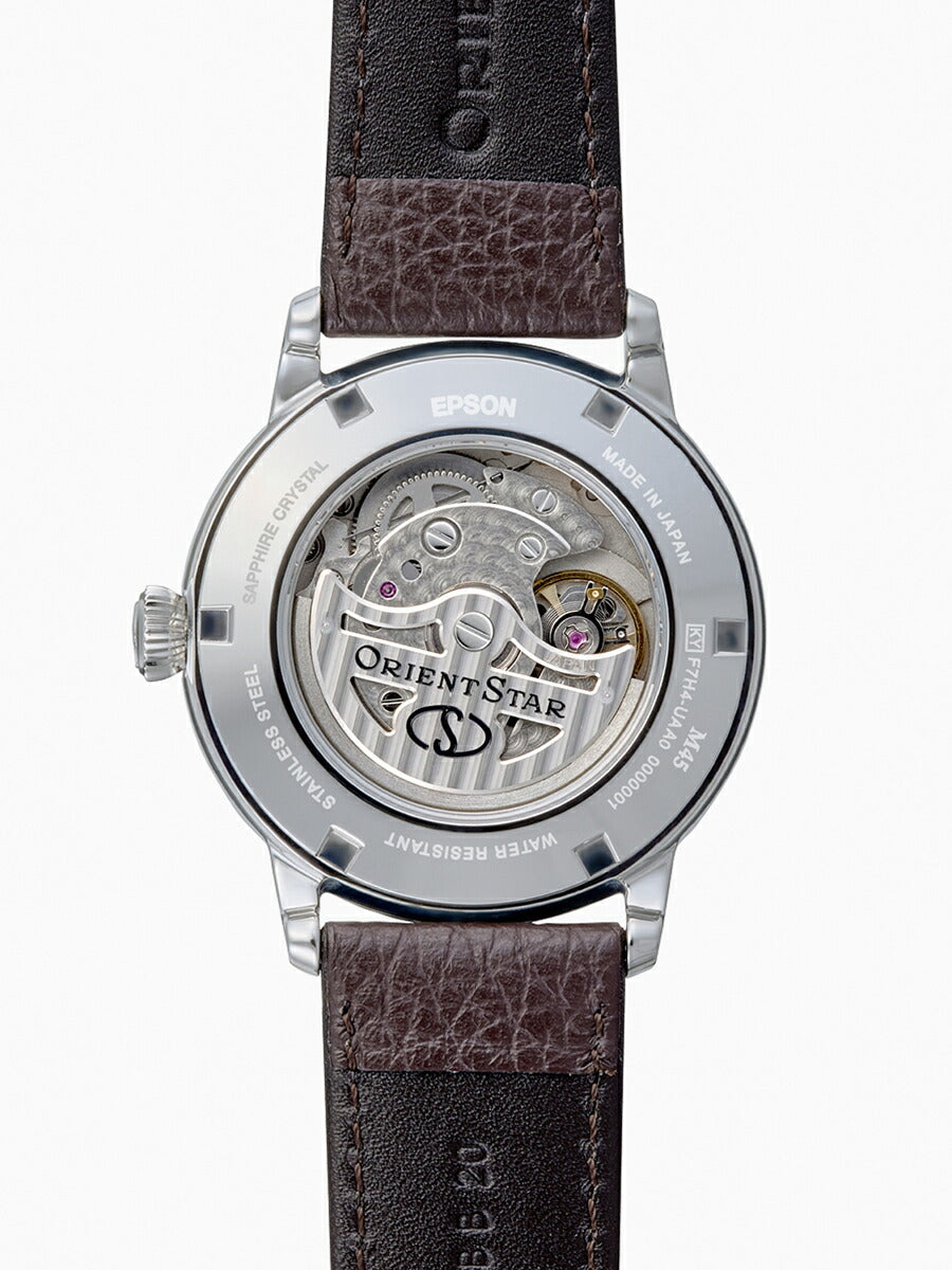 文字板全体には砂地模様と放射目を組み合わせたマットな質感を採用。一方で、オリエントスターの象徴であるパワーリザーブ表示は放射目を抑えた砂地仕上げとし、さりげなく存在感を際立たせています。6時位置のスモールセコンドにはサークル状の挽目模様が施され、奥行きのある立体的な表情をプラス。星粒のように穏やかにきらめく質感が、静かな夜空を思わせます。