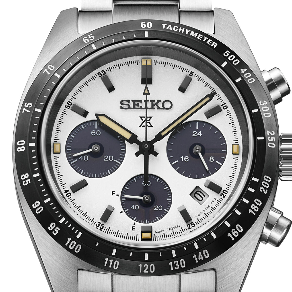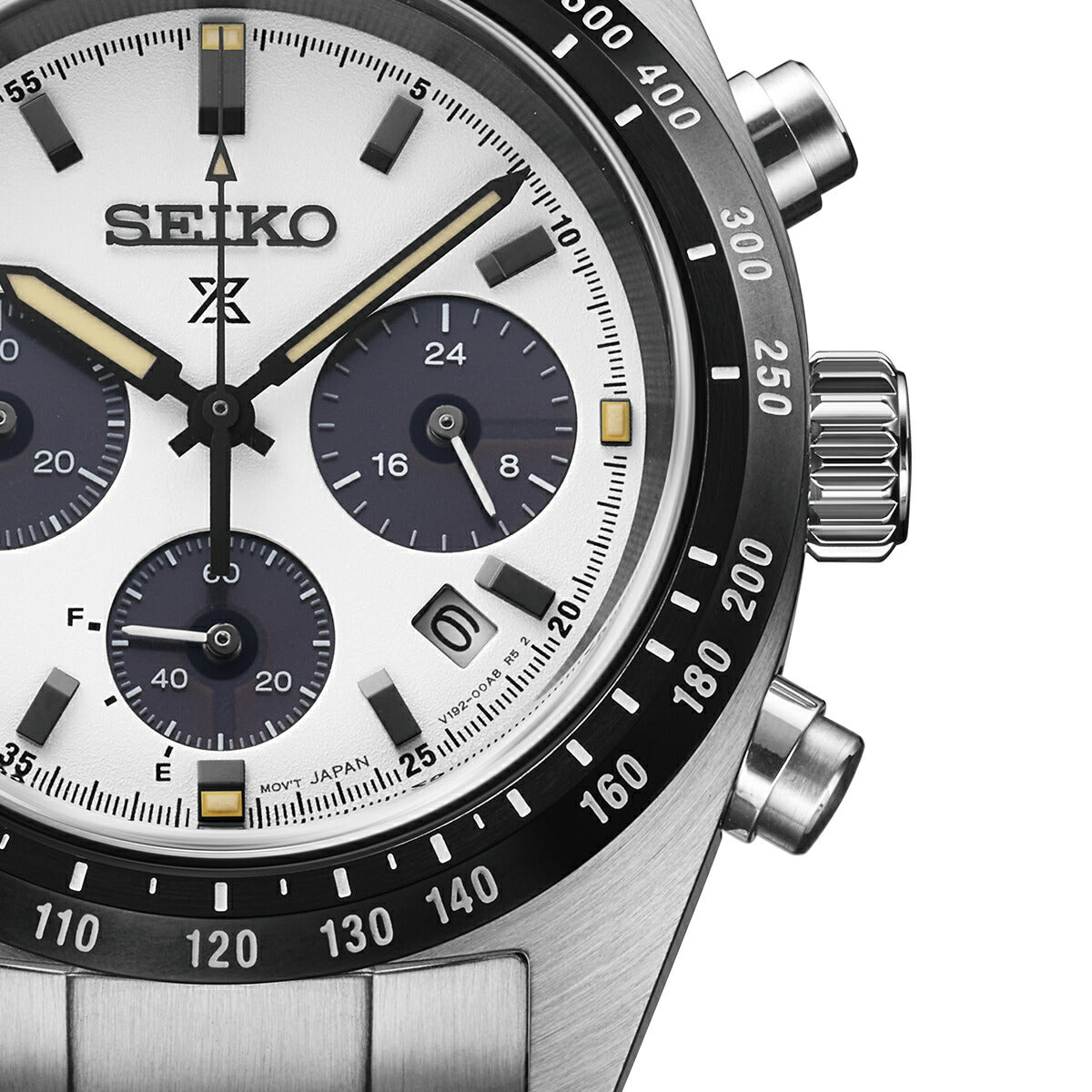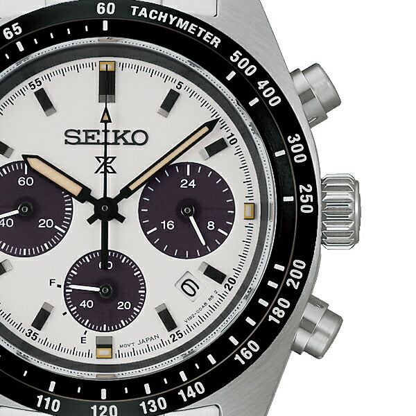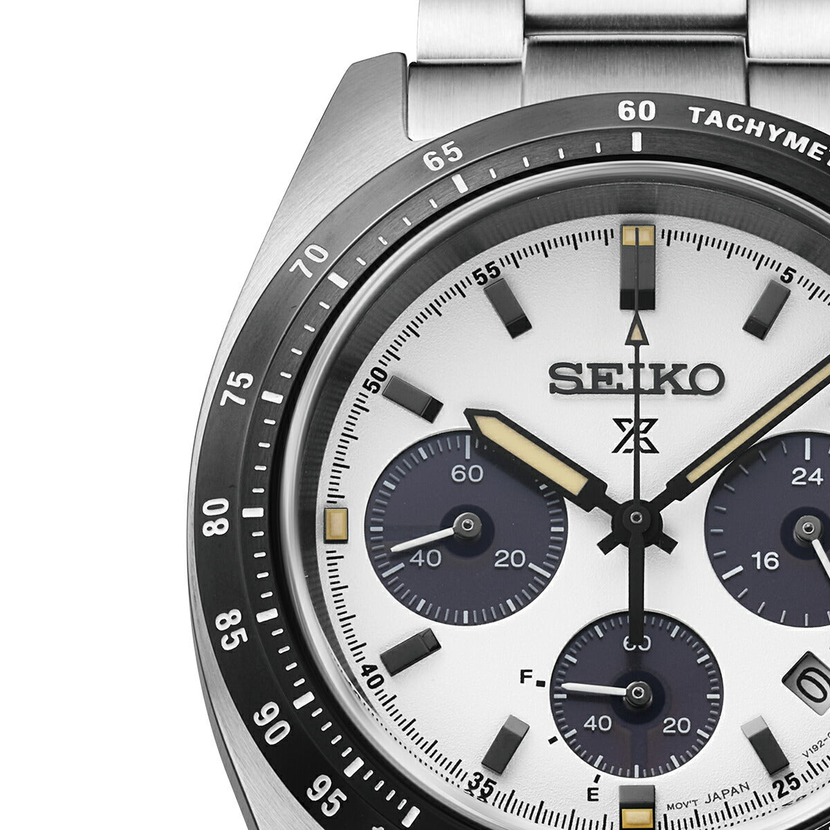 ダイヤルには、光の反射を抑える砂目調のパターンを採用。直射日光下でも高い視認性を確保し、本格スポーツウオッチとしての信頼感をしっかりと感じさせます。タキメーターベゼルやクロノグラフのレイアウトも、計器としての役割を直感的に理解できるデザインで、機能美を大切にするセイコーらしさが随所に表れています。