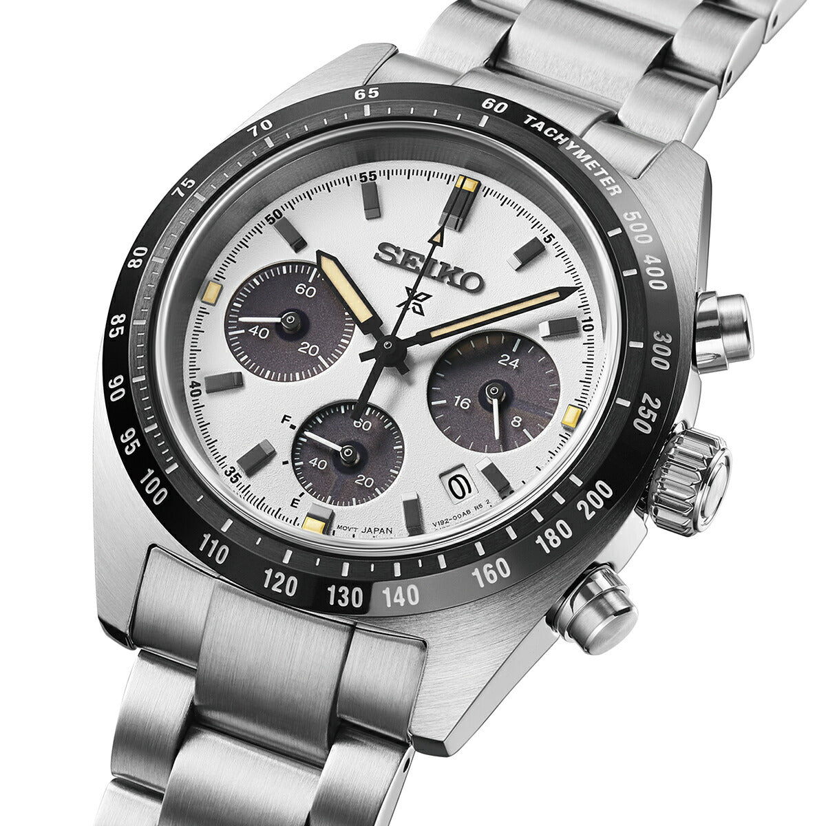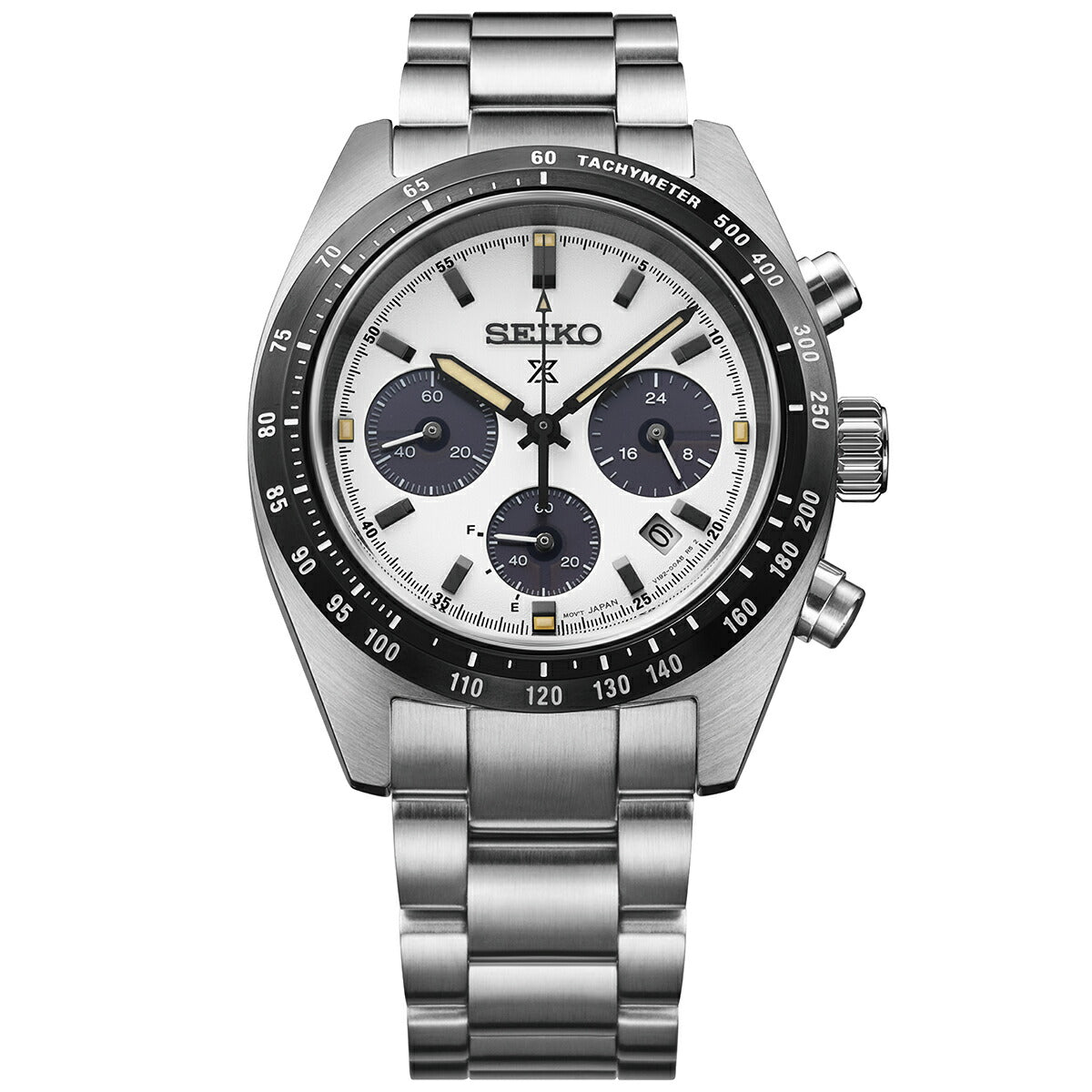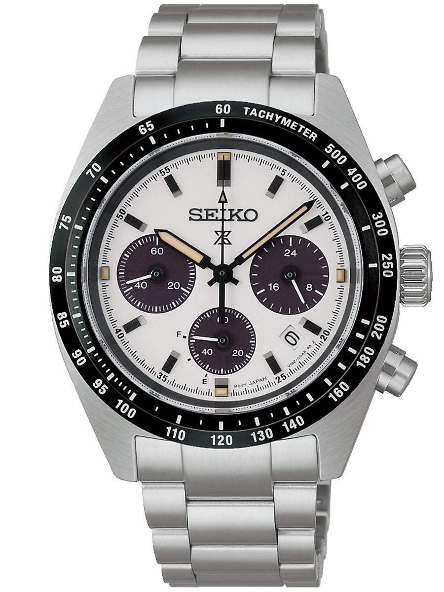ダイヤルには、光の反射を抑える砂目調のパターンを採用。直射日光下でも高い視認性を確保し、本格スポーツウオッチとしての信頼感をしっかりと感じさせます。タキメーターベゼルやクロノグラフのレイアウトも、計器としての役割を直感的に理解できるデザインで、機能美を大切にするセイコーらしさが随所に表れています。