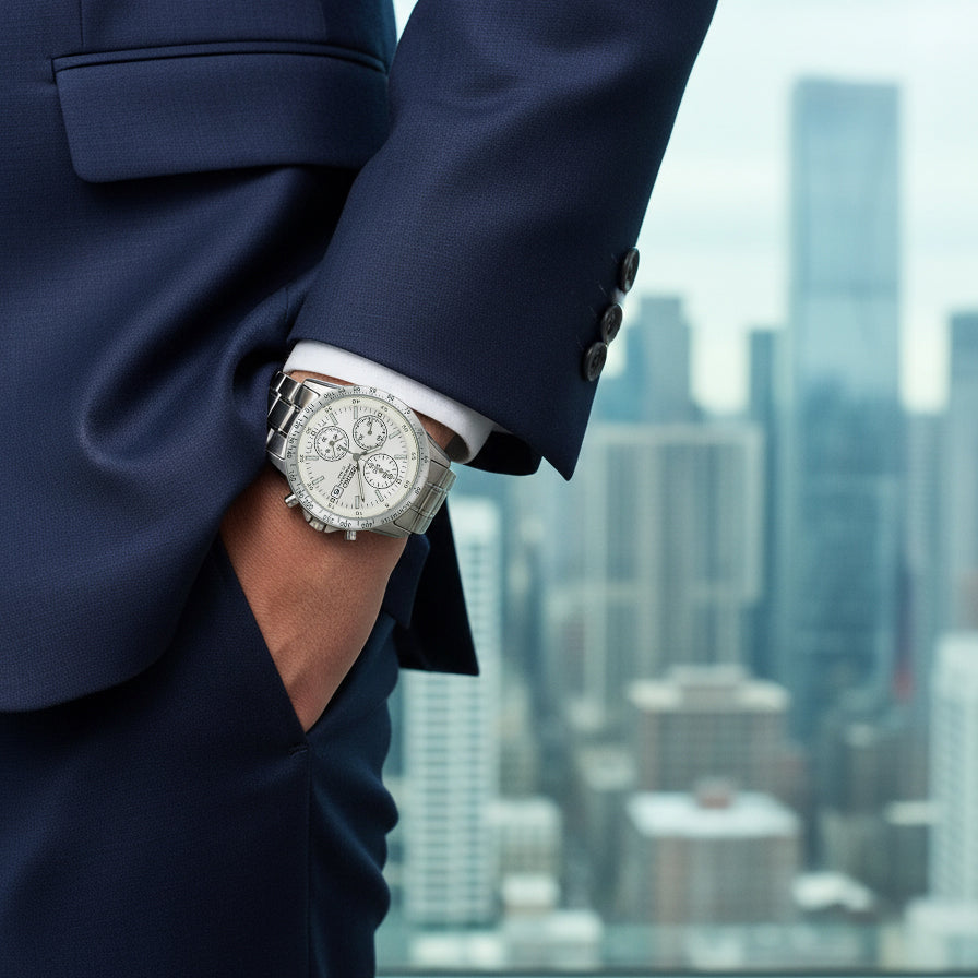 ホワイトの文字盤にシルバーカラーのインデックスと針を組み合わせ、視認性と上品さを両立。
