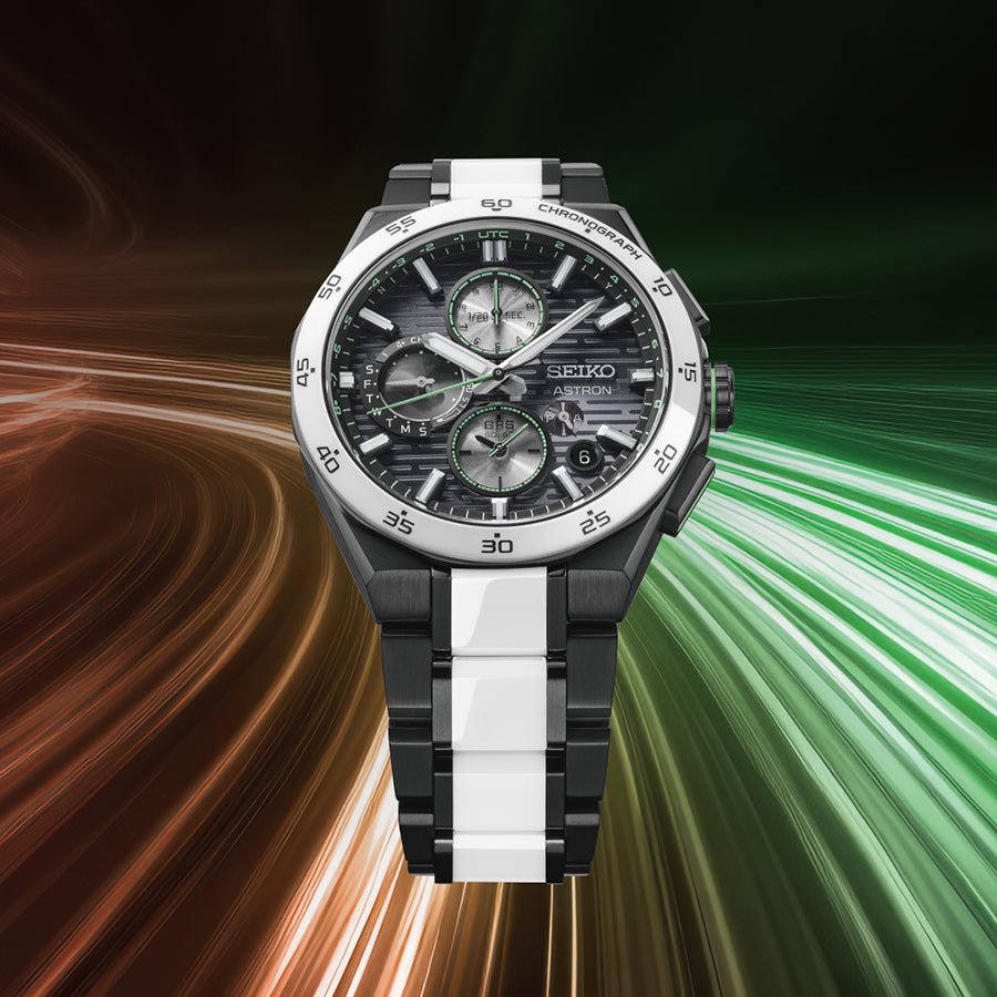 トレンドを意識したビビッドなライトグリーンをアクセントに加え、近未来的な存在感を放つカラーリングが魅力です。二体構造のベゼルには、セラミックスと多角形状のアルミ飾り縁を組み合わせた特別仕様を採用。ダイヤルには駆け抜ける光をイメージした横縞の型打ちパターンが施され、質感豊かな表情を演出します。