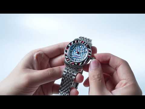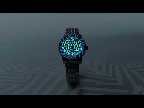 文字盤手作業アーティストとして名高いChris Alexander氏とのコラボレーションモデルでもあり、複雑に入り組んだラインとコントラストの効いた配色が、まるでアートピースのような存在感を演出します。ベゼルにも大胆なパターンと差し色を施し、海を想起させるダイバーズスタイルとアート性を融合させた仕上がりです。