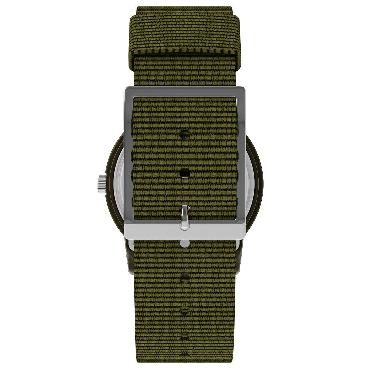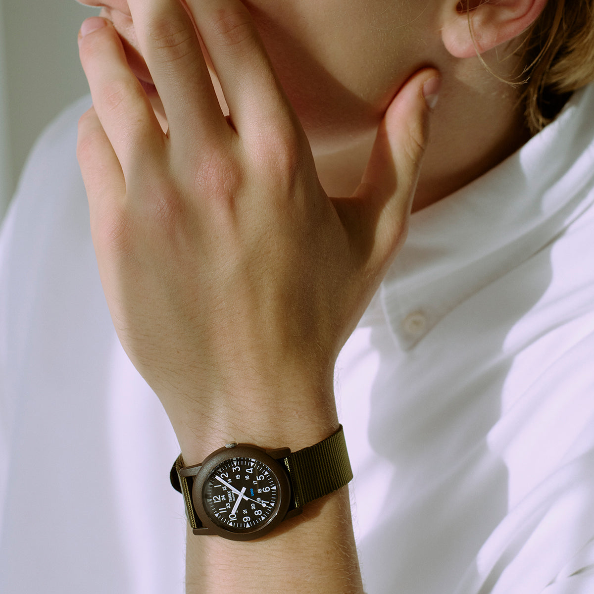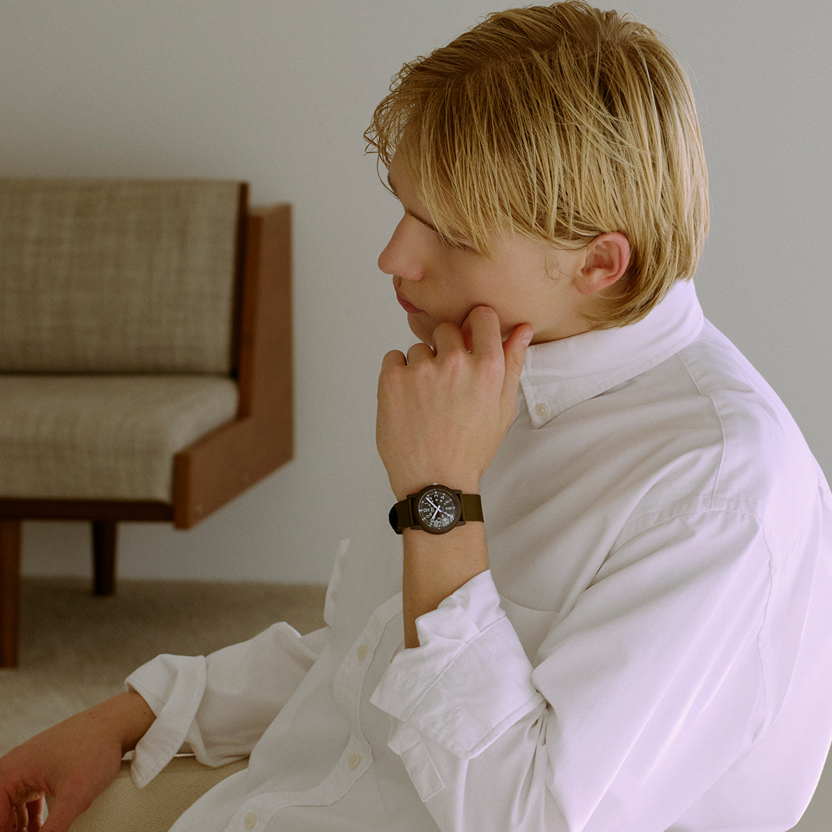 マットなオリーブカラーのケースとカーキグリーンのナイロンストラップが、ミリタリーテイストをさりげなく演出。軽量でストレスのない着け心地も魅力です。