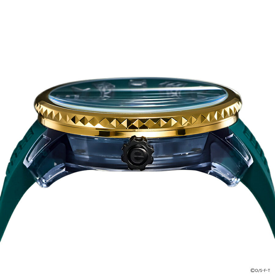 深みのあるグリーンのダイヤルとシリコンベルトは、ゾロの衣装や落ち着いた性格をイメージ。ゴールドのベゼルがアクセントとなり、武士のような気品を漂わせます。
