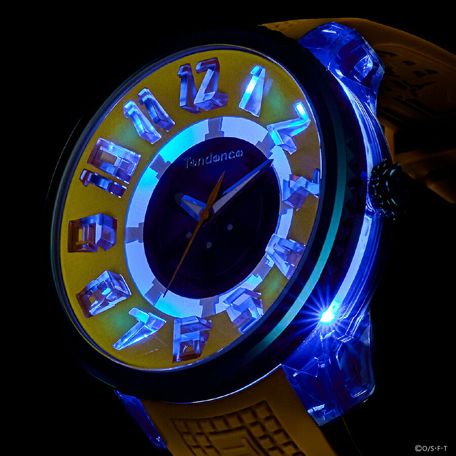ベースとなるのは、テンデンスの代表作「FLASH(フラッシュ)」。インパクトのあるビッグフェイスと立体的なインデックスに加え、7色+レインボーに輝くLEDライトを搭載した、遊び心あふれるモデルです。